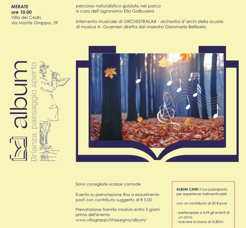album Percorso naturalistico e musica con Orchestralab ALBERI E MUSICA D’AUTUNNO A VILLA DEI CEDRI domenica 9 Novembre 2025 ore 10.00 Merate (LC) Scopri di più ALBUM BRIANZA PAESAGGIO APERTO