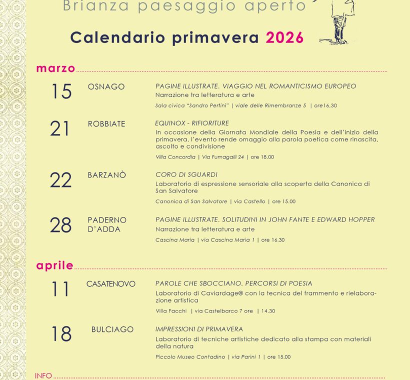 L'evento "Album Brianza Paesaggio Aperto" offre una serie di appuntamenti dal 15 marzo all'18 aprile, esplorando l'arte, la letteratura e la poesia in diverse location della Brianza. Tra i principali…
